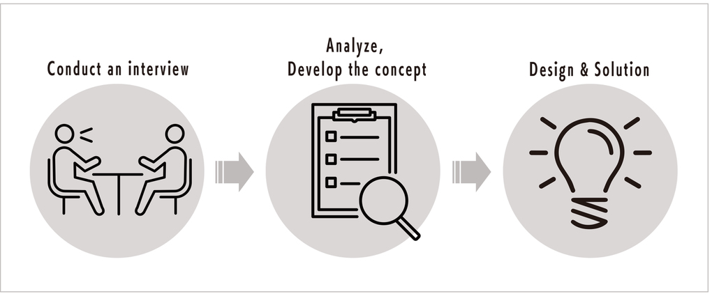 デザインの仕事は色やカタチ、見た目のおしゃれさを整えるものと思われがちですが、その本質は「課題の発見とその解決」です。良いデザインを作るには、視覚的な素敵さを生み出す直感や感性と同じくらい、洞察力や論理的思考が重要です。デザイン制作の前に、ヒアリングとマーケティング分析でお客様の商品/会社/事業の強みや課題を探ります。その後、課題の解決策としてのデザイン(商品の色や形、パッケージなど意匠的な要素)を提案いたします。