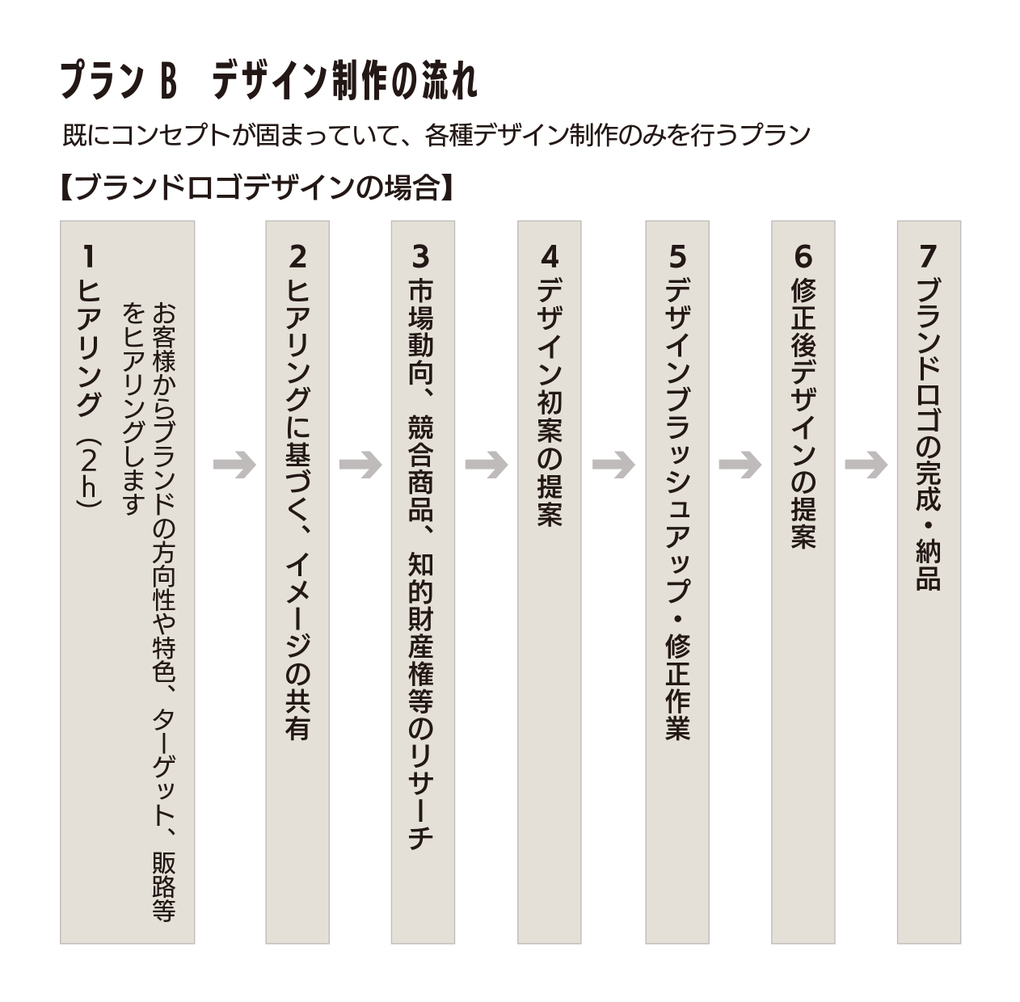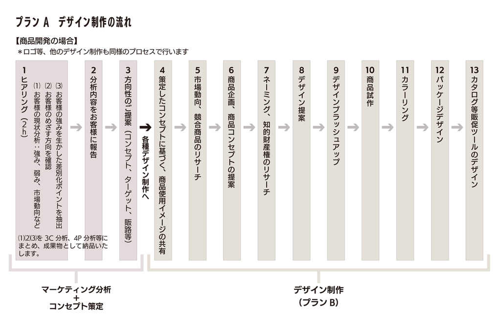 すでに商品のコンセプトやターゲットなどの方向性が定まっているお客様向けです。プラン A のマーケティング分析作業を割愛し、デザイン制作のみを行います。