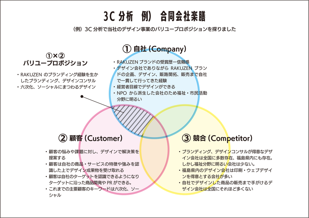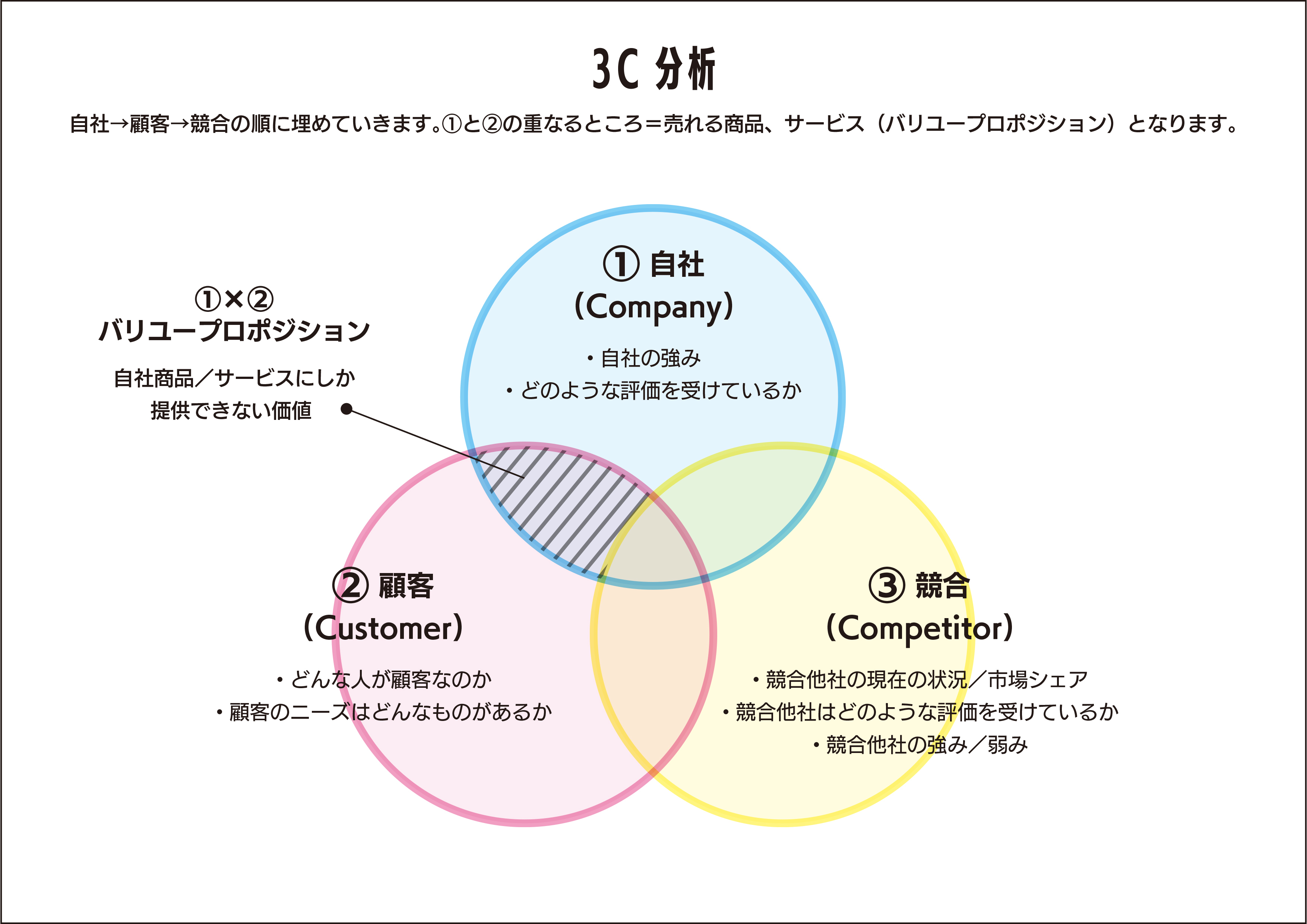3 つの視点から分析することで、市場を確認し、自社の強みや競合他社の強みが明確になります。①と②が重なる部分を見つけられると事業の方向性が見えてきます(バリユープロポジション)。