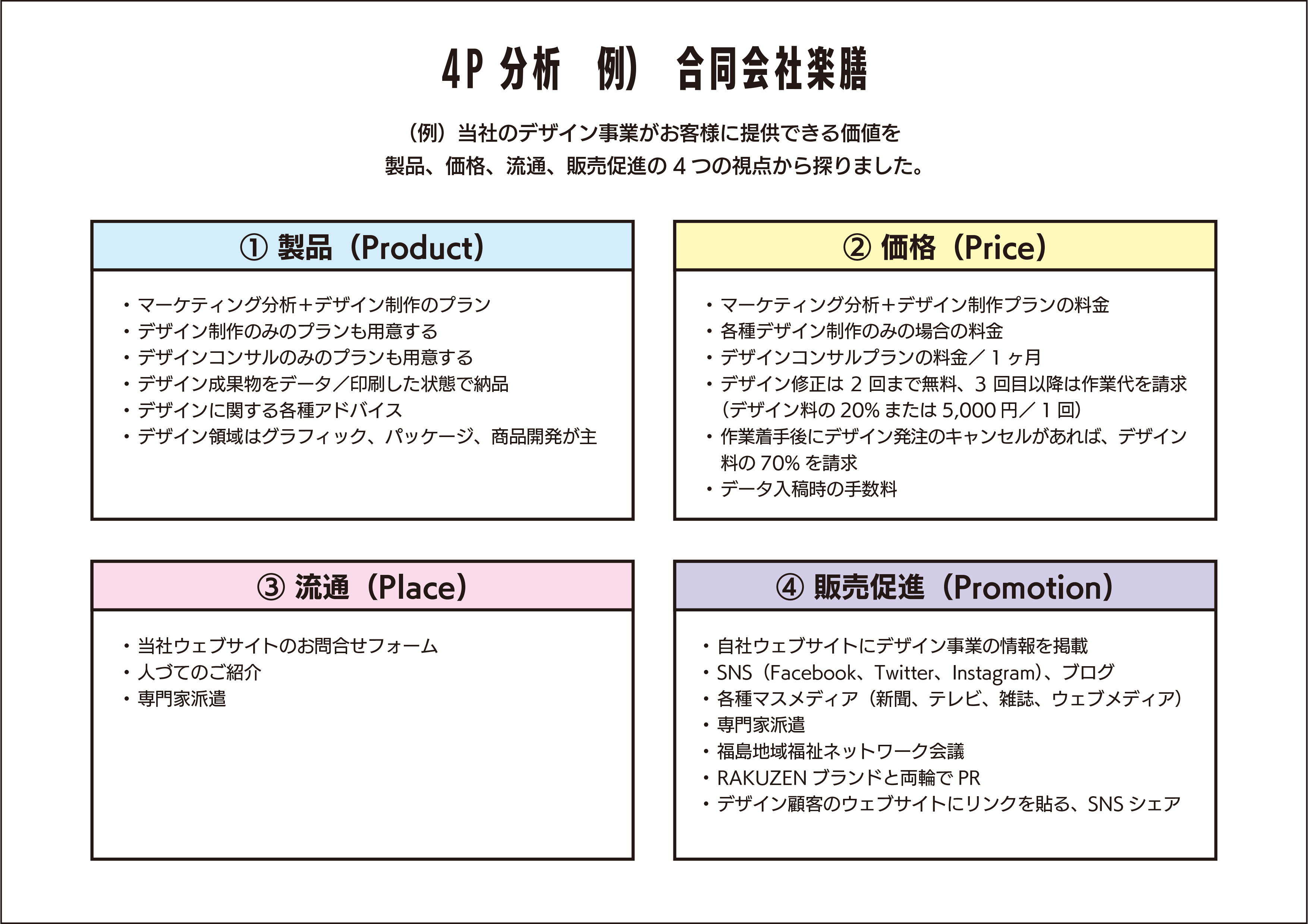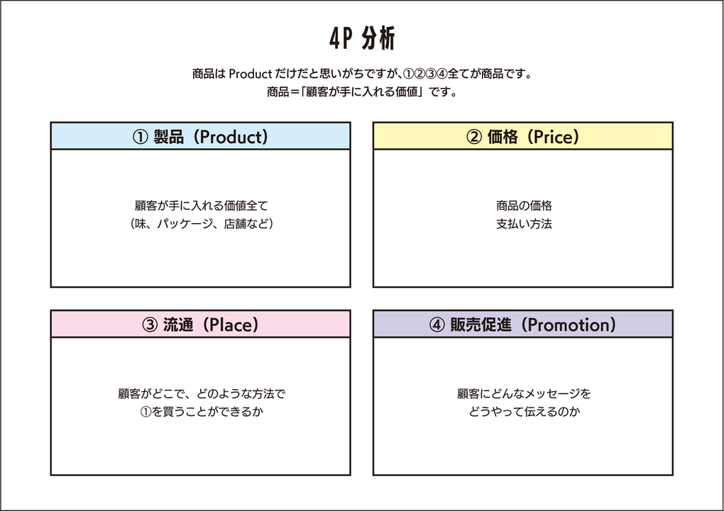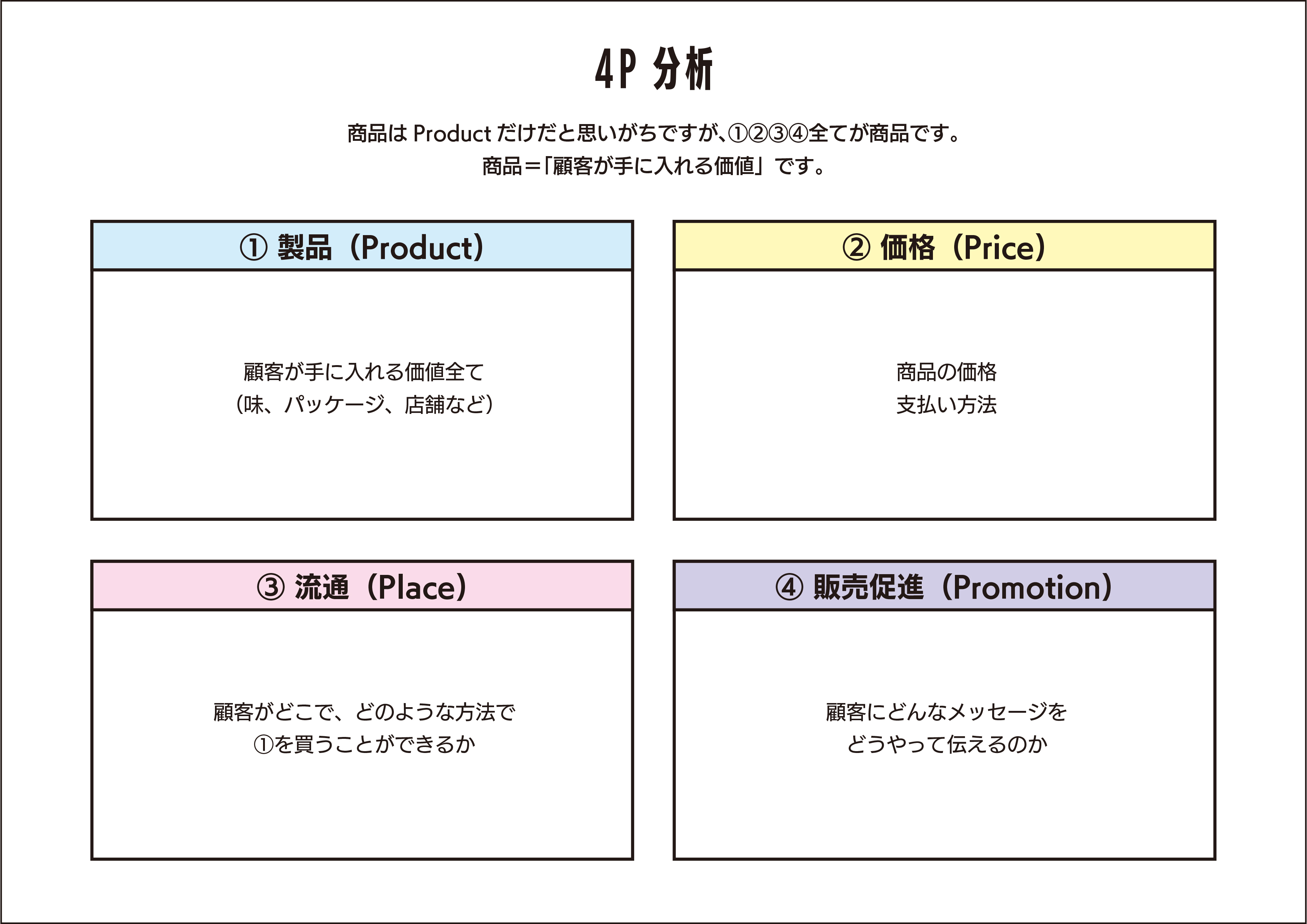 4 つの要素(マーケティング・ミックス)からターゲット市場を分析し、自社製品の強みや課題を明らかにすることで販売戦略を立てることができます。
