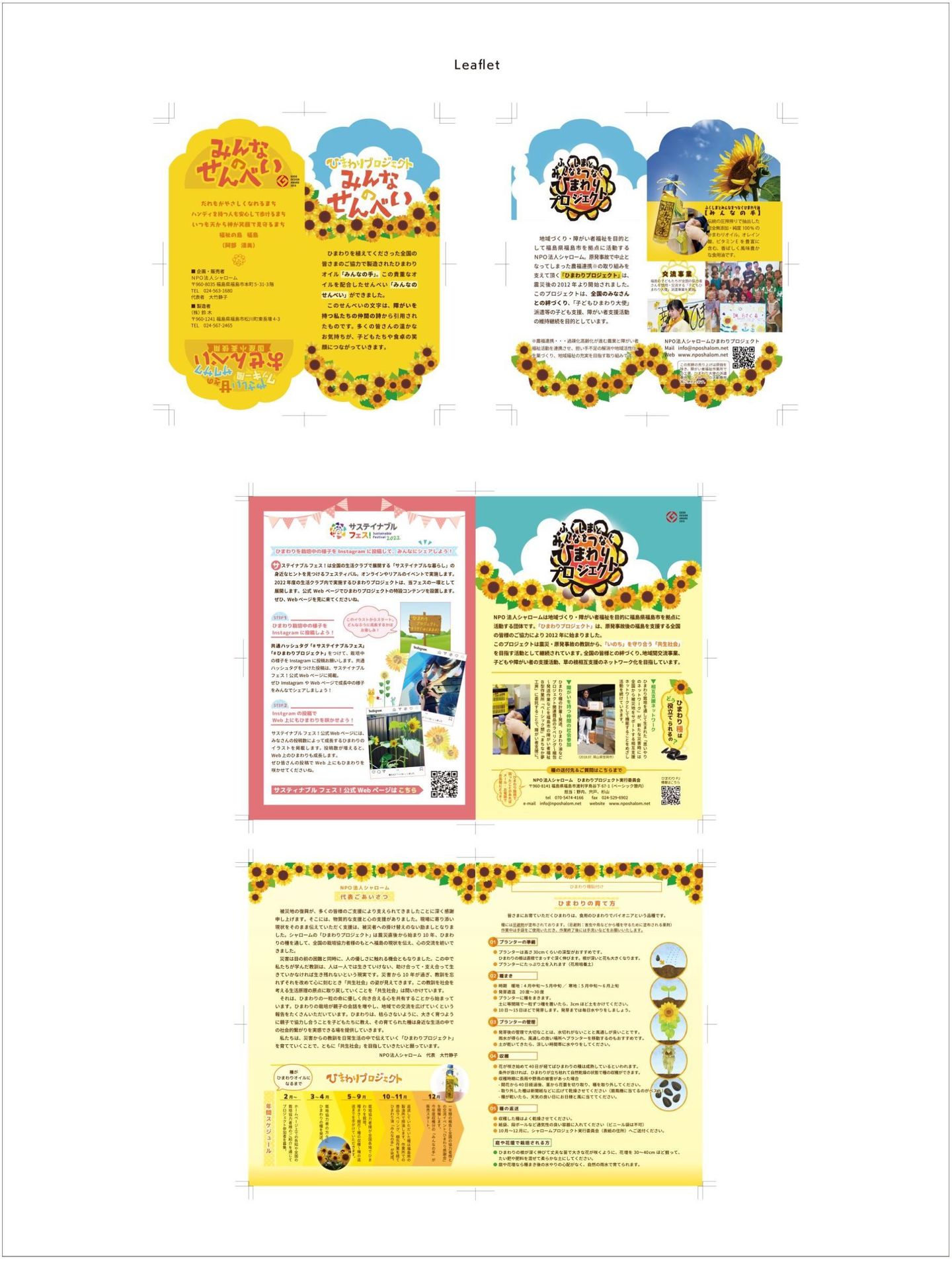 NPO 法人シャロームは地域づくり・障がい者福祉を目的に福島市を拠点に活動する団体です。「ひまわりプロジェクト」は東日本大震災と原発事故後の福島支援から始まったプロジェクトで、2012 年から展開されています。当社ではプロジェクト発足直後から各種デザインを担当しております。
