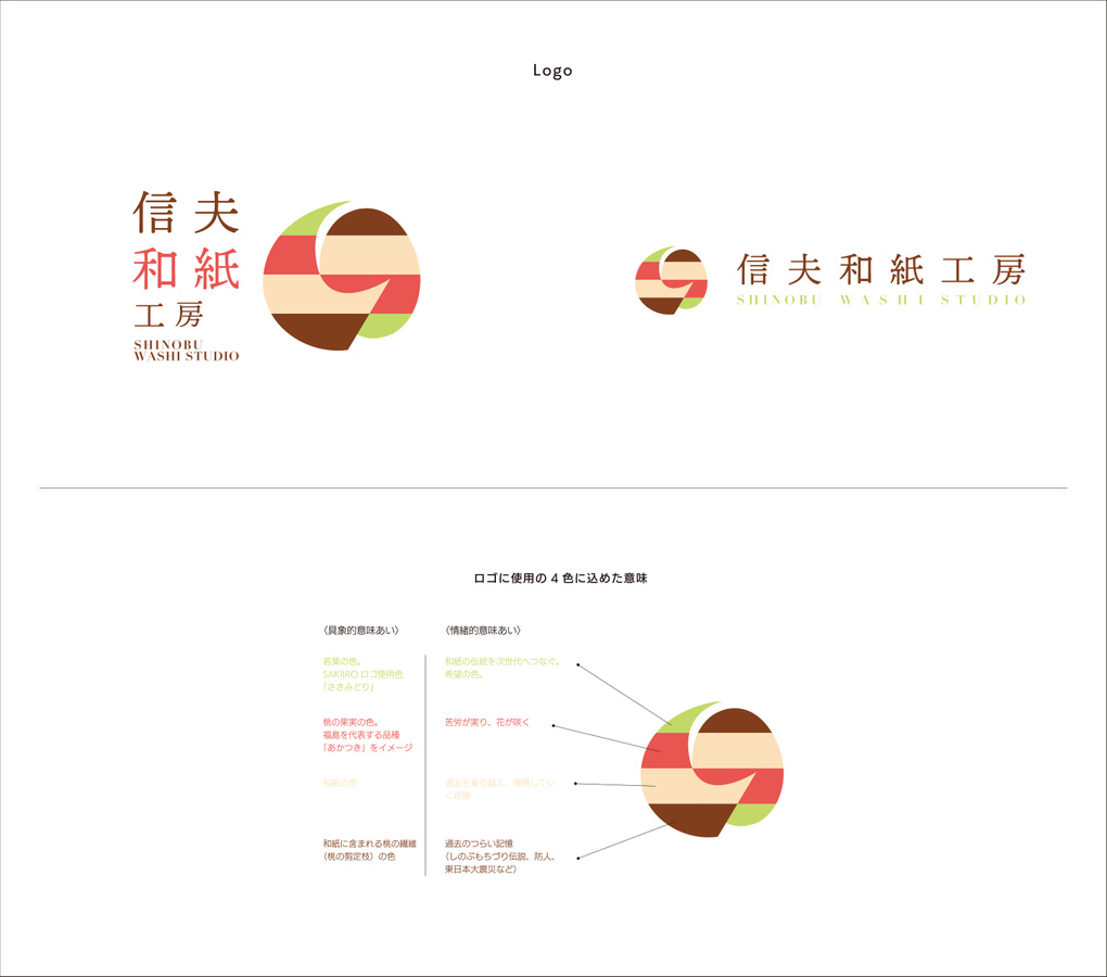 桃の和紙を通じて地域貢献をしたいという会社のビジョンを「桃 × 繭 × 紙」のモチーフを組合せたシンボルマークで表現したロゴマーク。福島市の産業が養蚕業から果樹産業へと変化してきた歴史の中で、紙はどちらの商品も包んできました。「紙は福島の産業に貢献してきた名脇役」という紙の会社らしい思いを大切にしました。