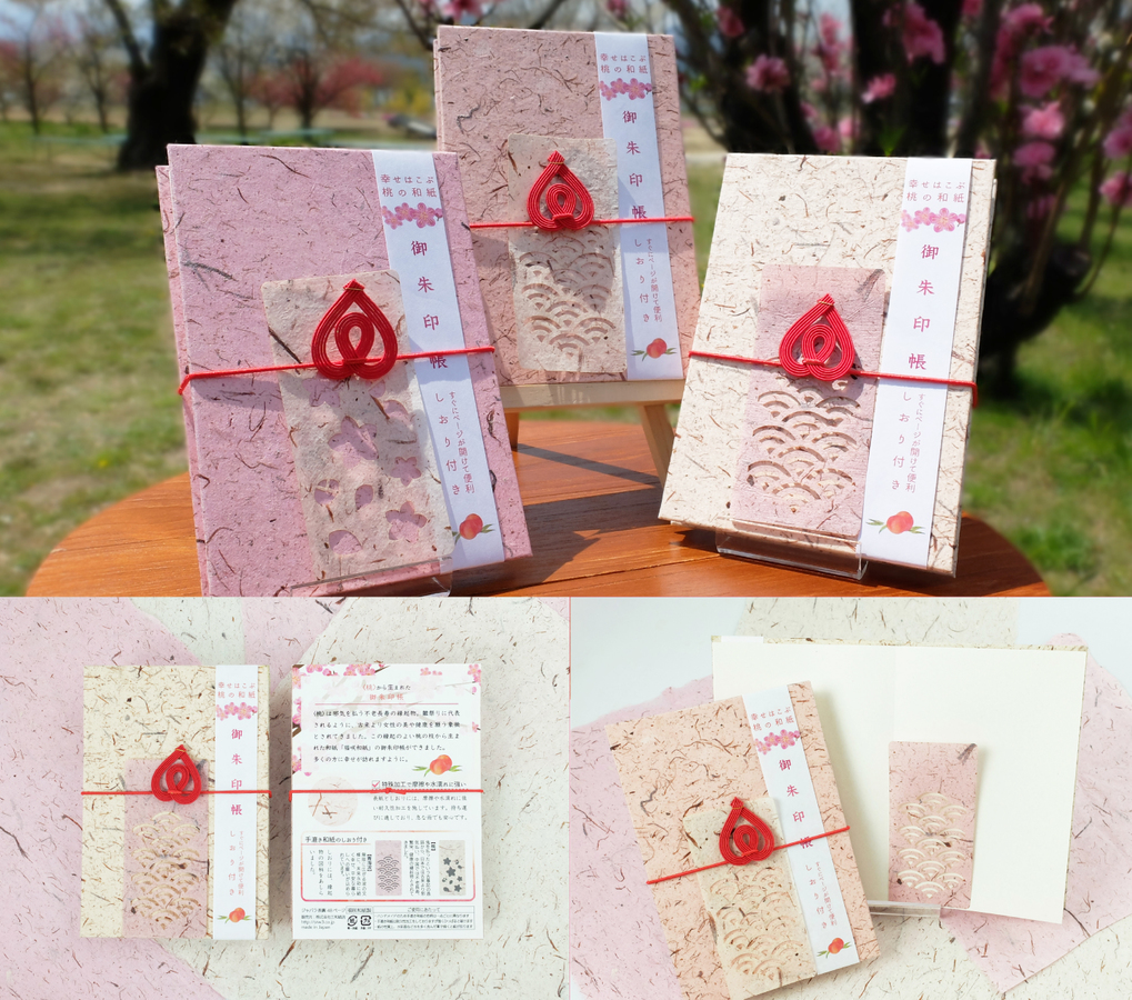 鬼を払ったという古事記の逸話から、桃は古来より邪気払いや不老長寿の縁起物とされてきました。桃の和紙ならではのストーリー性を生かす商品として御朱印帳を開発しました。