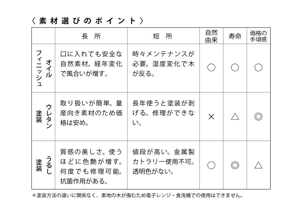 :オイルフィニッシュ仕上げの器は使い込むほどに美しい色艶と味わいを深めてゆきます。色の濃い食材は木に染みますが、それも使った証。木の景色のひとつとお考えください。