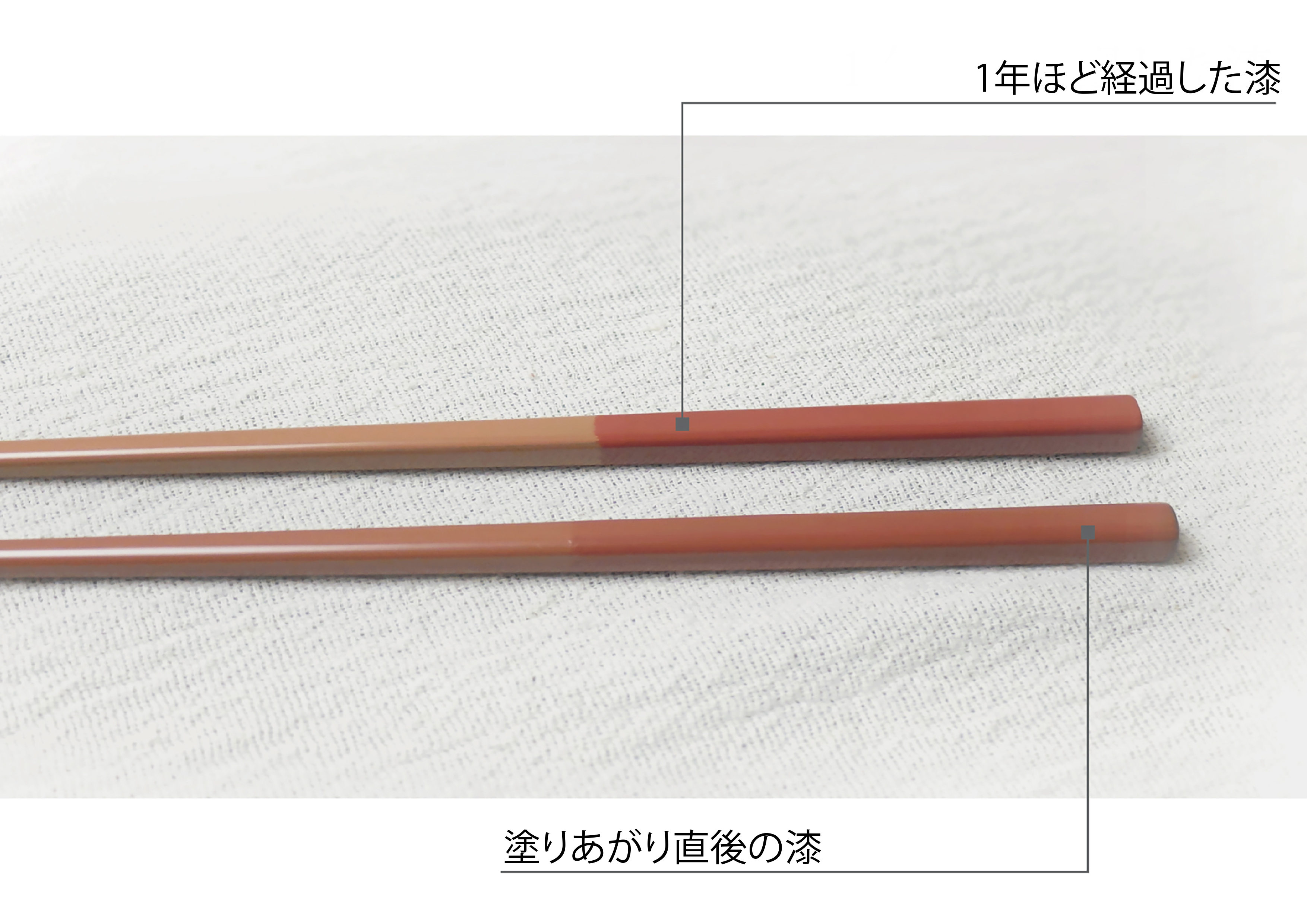 :漆器は時間とともに色が鮮やかに変化していきます。塗りたての漆は漆元来の褐色が強く出ていますが、長年使ううちに漆の色が退色していくためです。特に白漆、色漆は色の変化が顕著です。