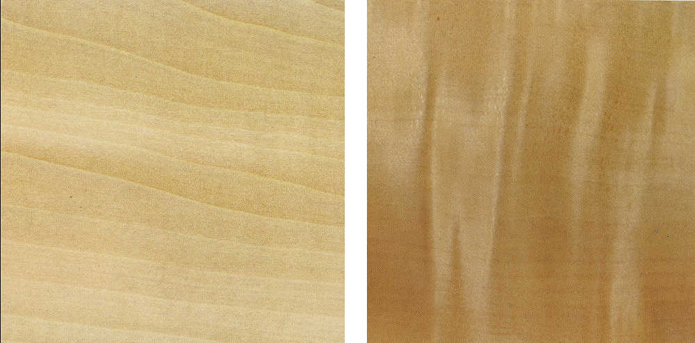 栃材は白木のやさしい風合いが魅力です。光を反射するとほんのり光って見える、質感の美しい木です。心材と辺材とに色みの違いは見られずどの部位でも白木です。栃材は建築、家具類から椀、餅つきの臼、杓子などの道具類まで幅広い用途があります。栃は細胞の並び方が特殊で、「リップルマーク」(写真右側)という縮み杢が出る特徴があります。栃の縮み杢は銘木として扱われます。