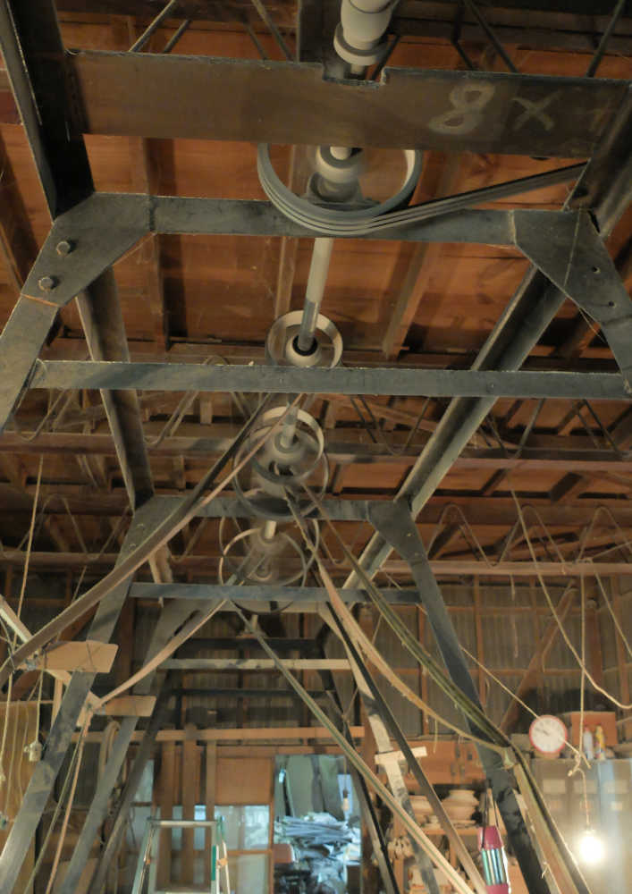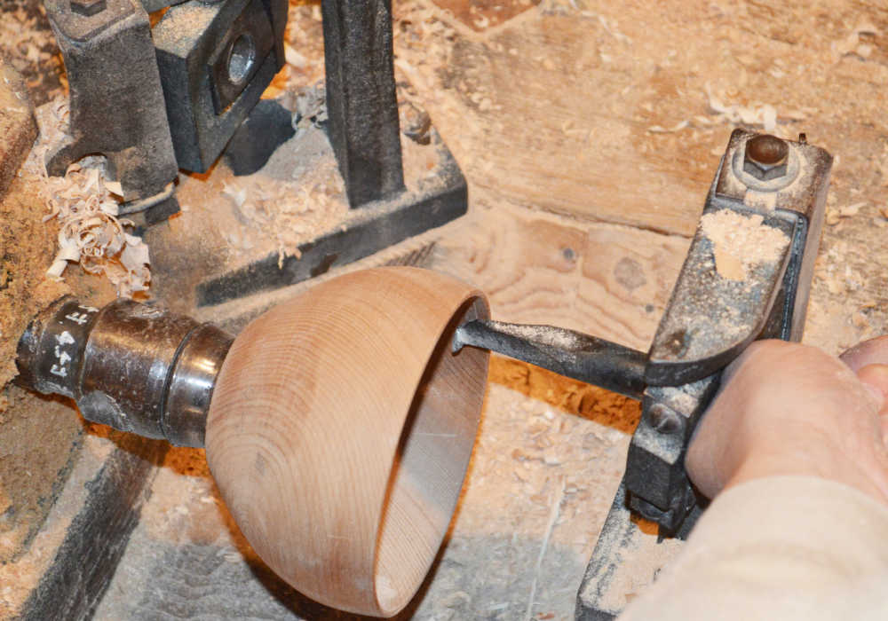 A potter’s wheel is used to carve the wood into a rough bowl shape.