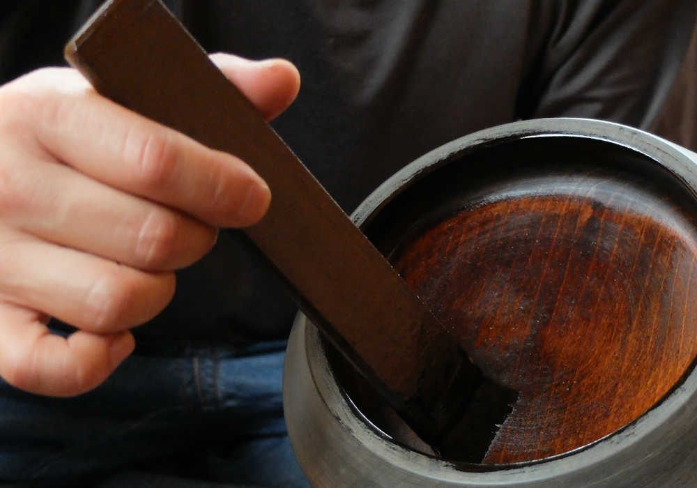 After applying fresh lacquer to treat the surface of the wood, a spatula made of white cedar is used to apply lacquer mixed with burnt diatomite powder to coat the surface. (The diatomite powder may be substituted with urethane paint.)