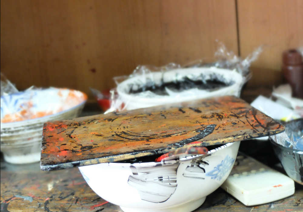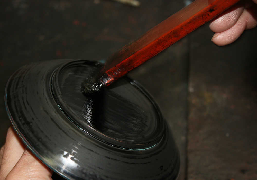 Any fine dust or bubbles are carefully removed from the surface of the bowl one at a time. This is a crucial step that ensures the lacquerware maintains its luster.