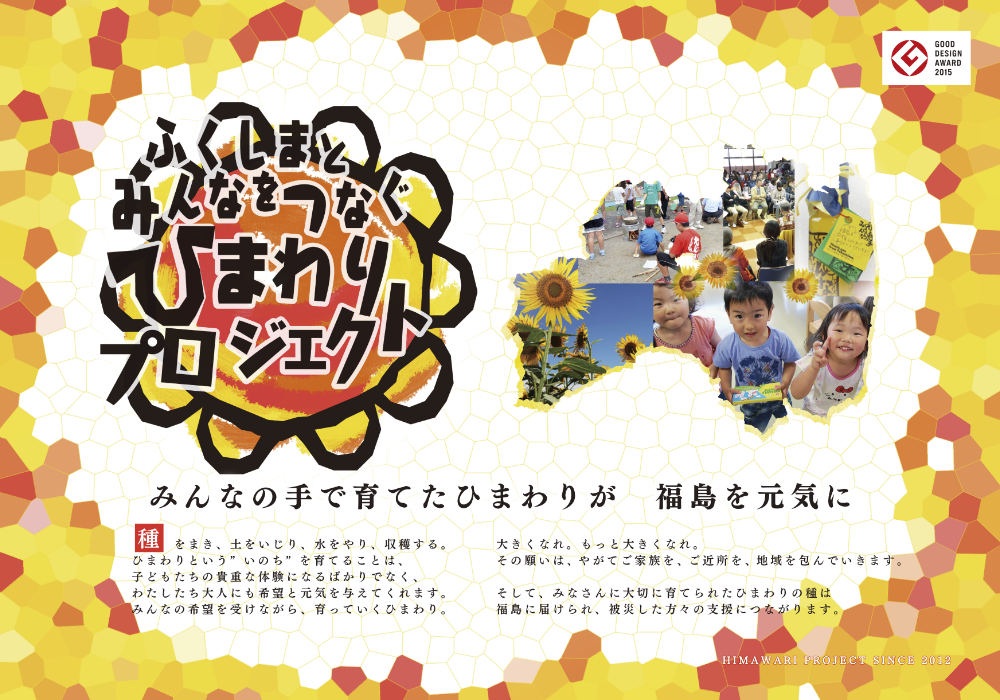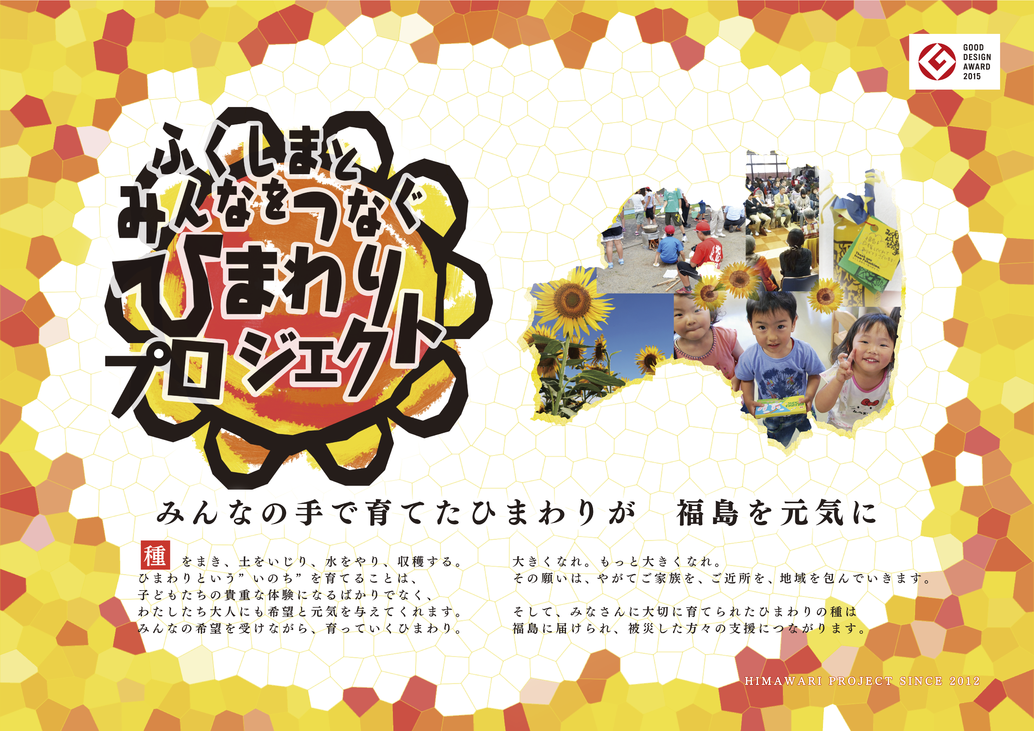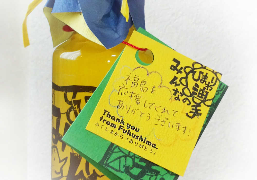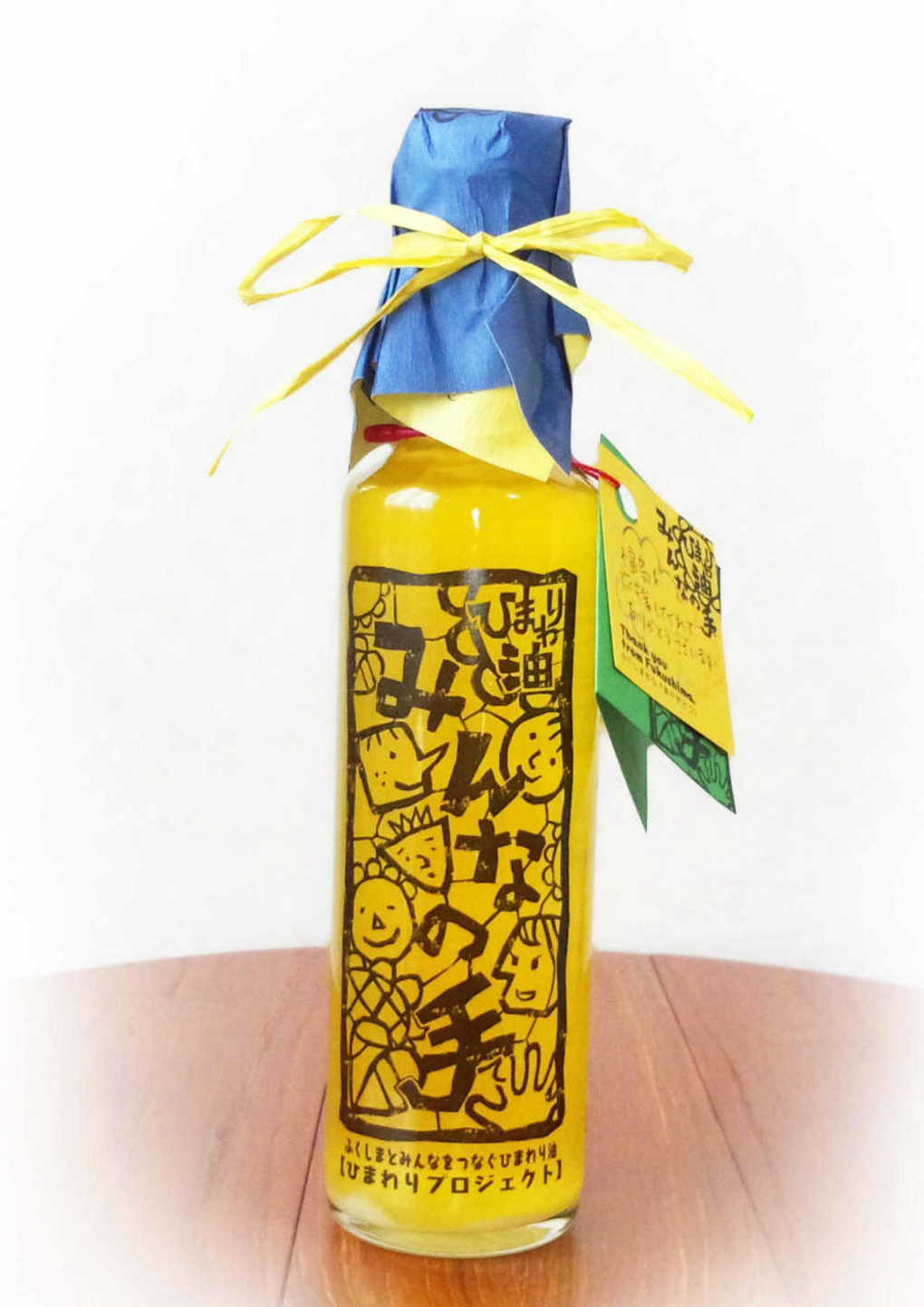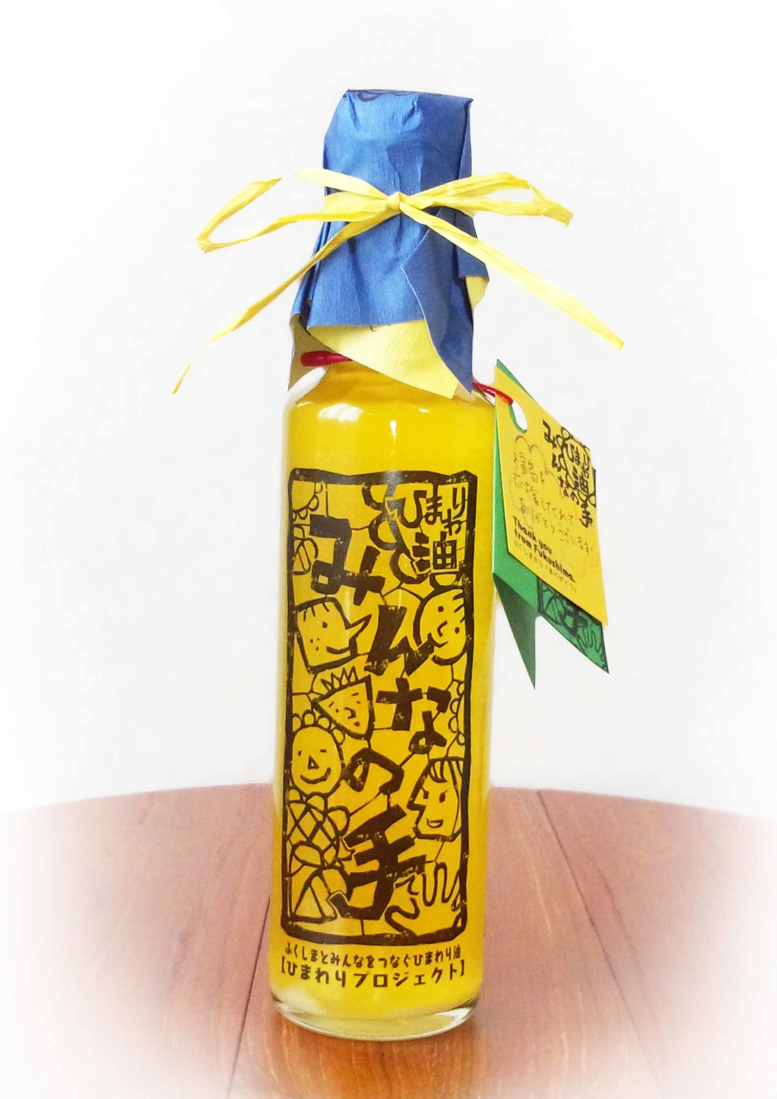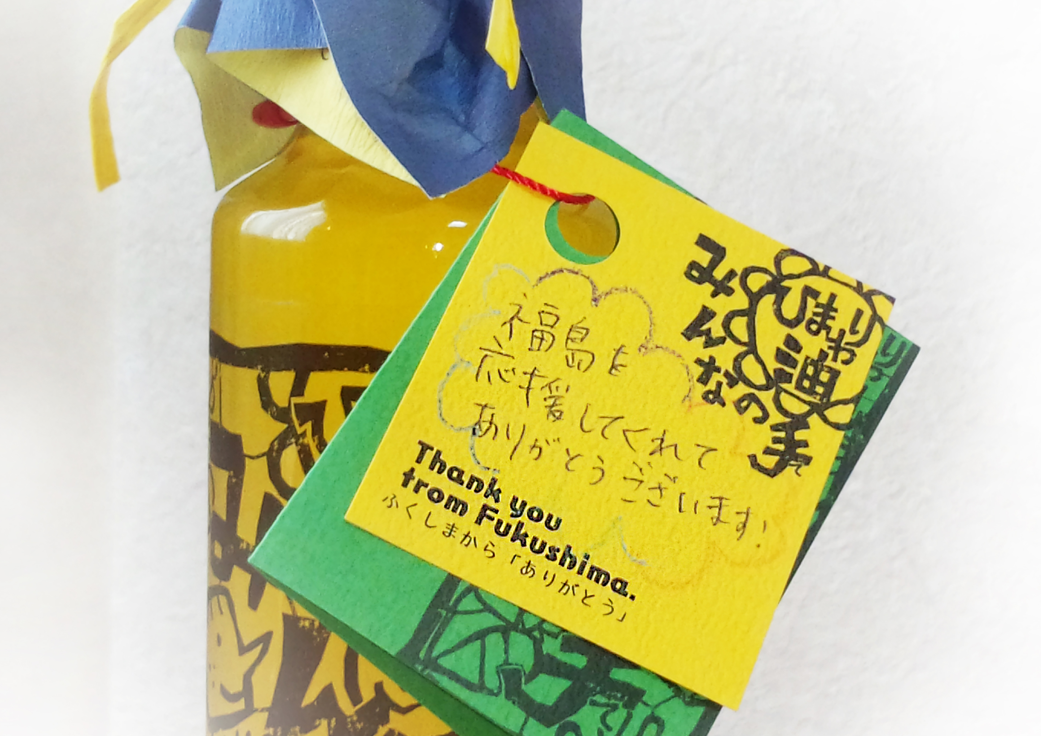 NPO法人シャロームの地域間交流事業「ひまわりプロジェクト」、ふくしまを応援するひまわりオイル「みんなの手」に関するデザインを担当いたしました。障がい者施設で手書きしたメッセージカードを添付し、プロジェクトの趣旨を伝えるパッケージが特長です。弊社商品のオイルフィニッシュ仕上げには「みんなの手」を使用しております。